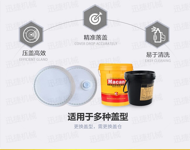 人工放蓋至料倉——自動剝離——自動吸蓋——自動掛蓋——自動滾壓蓋——自動出桶——一個循環(huán)完成。