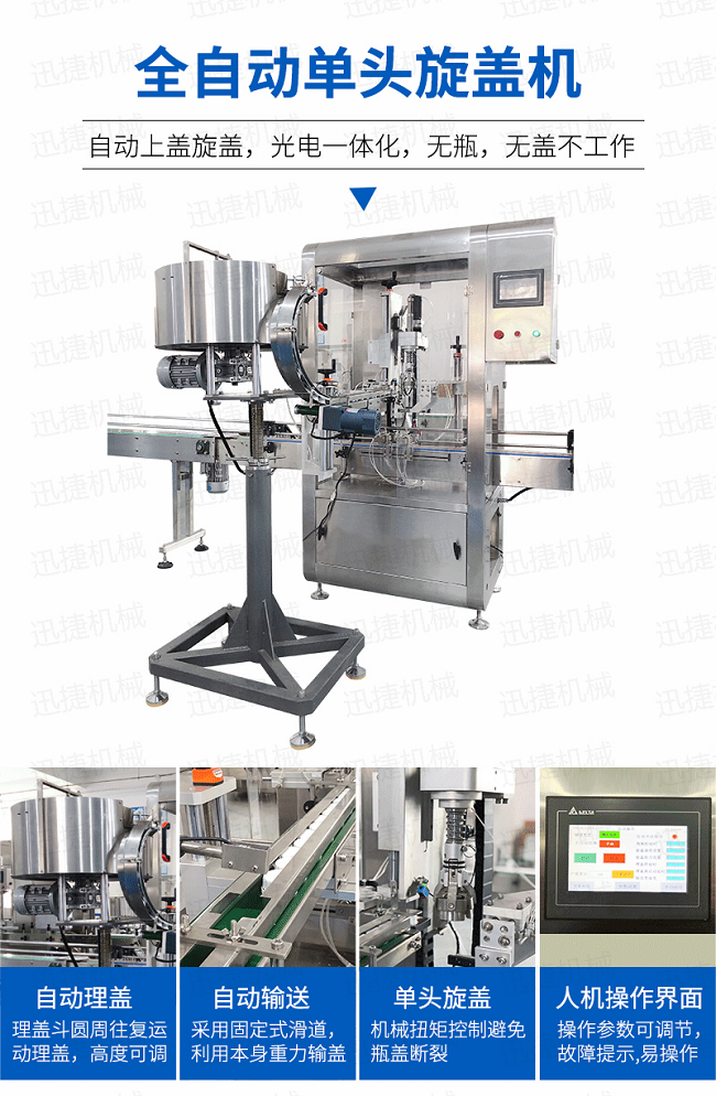 自動旋蓋線是我司在吸收技術的基礎上研發(fā)的一款新型自動生產線,特別適用于中小劑量液體灌裝和各種圓形瓶蓋,泵頭蓋,噴頭蓋,鴨嘴蓋,噴槍的鎖蓋。同時適用各種材質圓形、異形瓶,各種規(guī)格的瓶子灌裝旋蓋。微電腦自吸蠕動泵自動定量、氣動感應定位灌裝(根據需要也可不選配升降灌裝結構)等。具有灌裝平穩(wěn)、操作簡單、高速分裝、旋蓋等優(yōu)點。廣泛應用于醫(yī)藥、日化、飲料,酒水等行業(yè)。