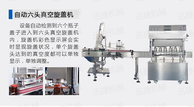 自動(dòng)供瓶機(jī)+全自動(dòng)滾筒洗瓶機(jī)+自動(dòng)六米烘干機(jī)+自動(dòng)收瓶機(jī)+全自動(dòng)六頭灌裝機(jī)自動(dòng)灌裝+全自動(dòng)提蓋機(jī)自動(dòng)理蓋、提蓋、掛蓋+六頭真空旋蓋機(jī)同時(shí)六個(gè)頭真空旋蓋+套標(biāo)機(jī)+收縮機(jī)+圓瓶貼標(biāo)機(jī)+整理平臺(tái);