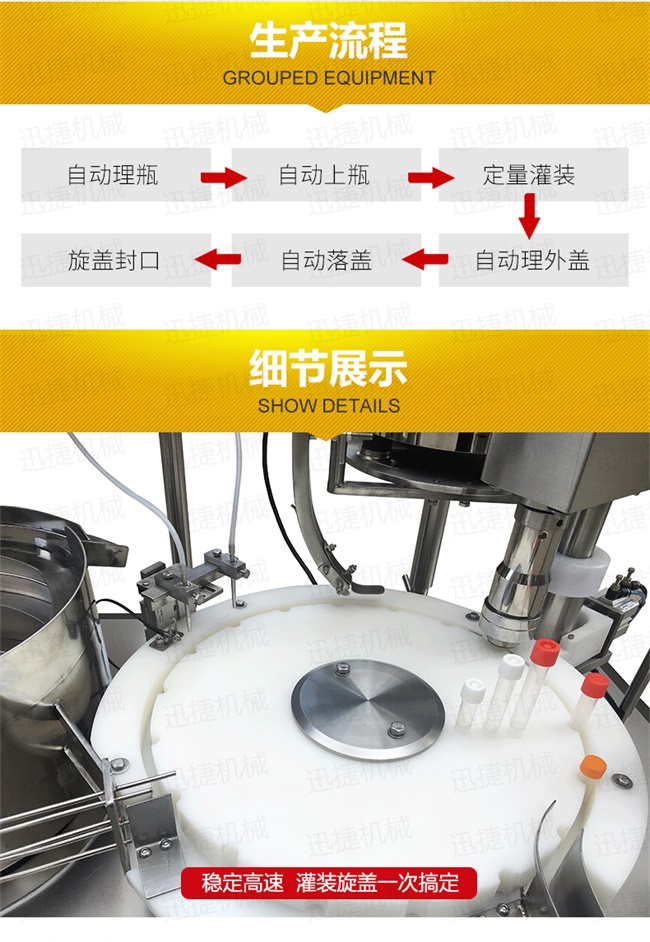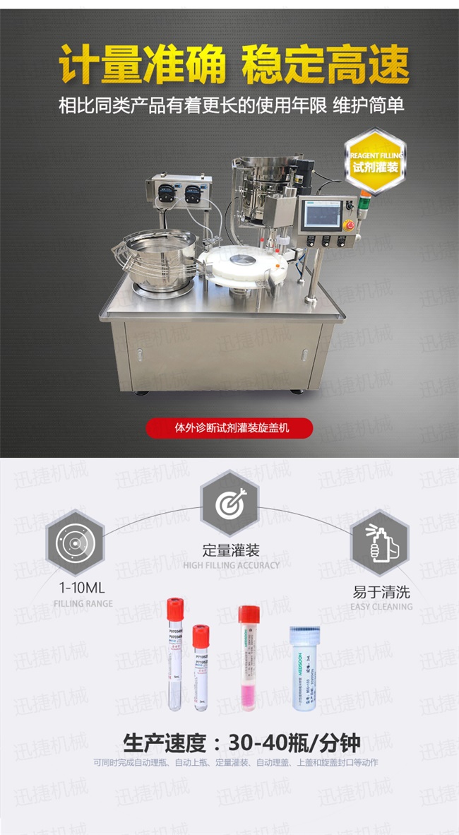 本機是在引進和吸收國外技術(shù)的基礎(chǔ)上,由我公司自主研發(fā)的一款I(lǐng)VD診斷試劑灌裝旋蓋一體機,能同時完成自動理瓶、自動上瓶、定量灌裝、自動理蓋、上蓋和旋蓋封口等動作。本機采用日本高精度封閉式凸輪分度工位器,精度高,運行可靠,使用壽命長。該分度器結(jié)構(gòu)簡單,長期使用無需維修。該型號設(shè)備主要用于ⅣD體外診斷試劑制藥、生物制藥行業(yè)及科研領(lǐng)域裝。機器設(shè)計緊湊合理、外形簡潔美觀,灌裝量調(diào)節(jié)方便。