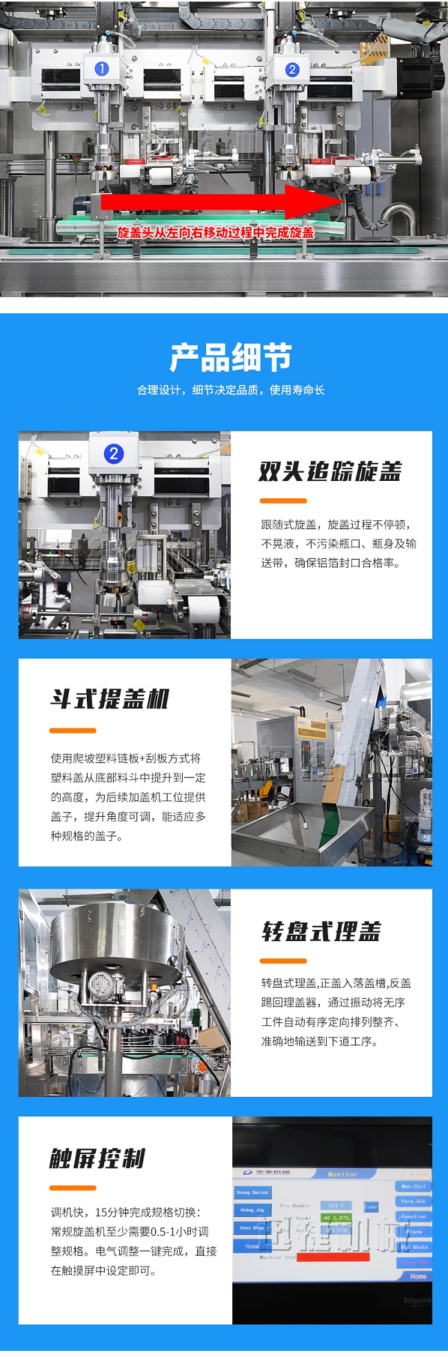 7、調(diào)機(jī)快,15分鐘完成規(guī)格切換:常規(guī)旋蓋機(jī)至少需要0.5-1小時調(diào)整規(guī)格。