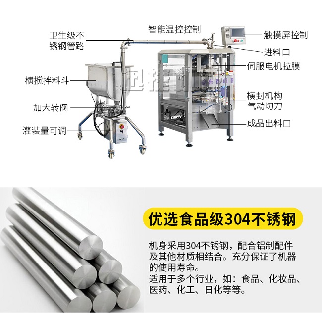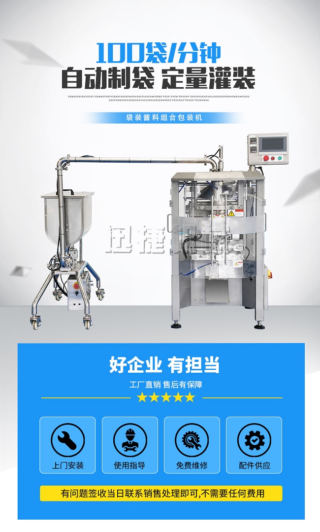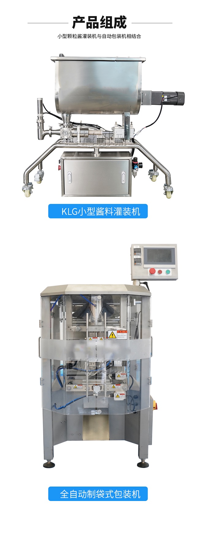本機(jī)器主要用于調(diào)味品醬料的自動(dòng)化包裝,機(jī)器安裝有橫向螺帶式攪拌,使油醬混合均勻,確保灌裝精度和產(chǎn)品包裝成品的均勻性。灌裝計(jì)量設(shè)備安裝有萬向輪,管路鏈接均采用快拆接頭,方便灌裝機(jī)拆卸移動(dòng)清洗。包裝設(shè)備采用全伺服驅(qū)動(dòng)器,包裝速度快,運(yùn)行穩(wěn)定。設(shè)備構(gòu)成組件:攪拌式定量灌裝機(jī)一臺(tái)管道鏈接組件2米。
