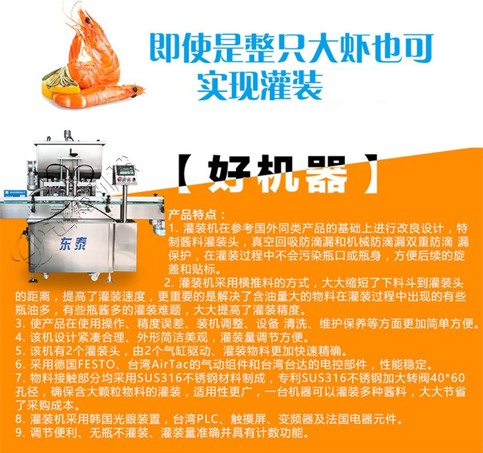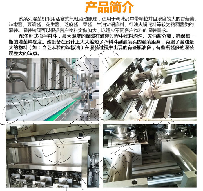 該系列灌裝機(jī)采用活塞式氣缸氣動(dòng)原理,適用于調(diào)味品中帶顆粒并且濃度較大的香菇醬、辣椒醬、豆瓣醬、花生醬、芝麻醬、果醬、牛油火鍋底料、紅油火鍋底料等較為粘稠醬類(lèi)的灌裝。灌裝轉(zhuǎn)閥可以很具客戶(hù)物料定做加大,以適應(yīng)不同客戶(hù)物料的灌裝需求。