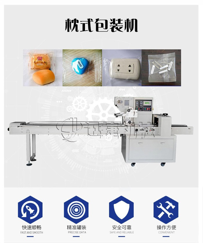 該包裝機為全自動枕式包裝機,適用于各種固型產(chǎn)品的包裝,如食品類(方便面、面包、漢堡、餅干、雪糕、冷凍食品),日用品(肥皂、餐巾紙),五金配件,機械零件(軸承),橡膠制品(輪胎)等產(chǎn)品的枕式包裝。